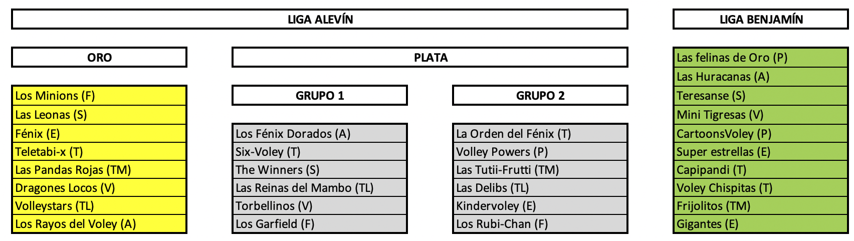 La liga se divide en 2 categorías, una alevín que a su vez se divide en oro y plata y otra benjamín.